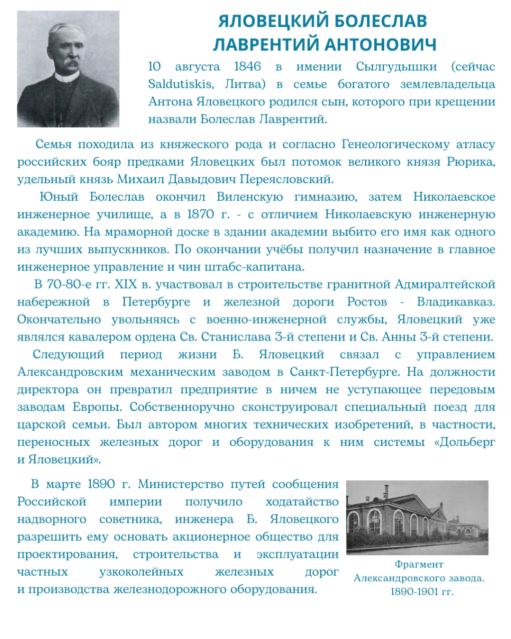 📑 Инженер, генерал корпуса военной инженерии России, главный технический инспектор царских железных дорог, директор Александровского паровозостроительного завода, владелец Товарищества подъездных железнодорожных путей.